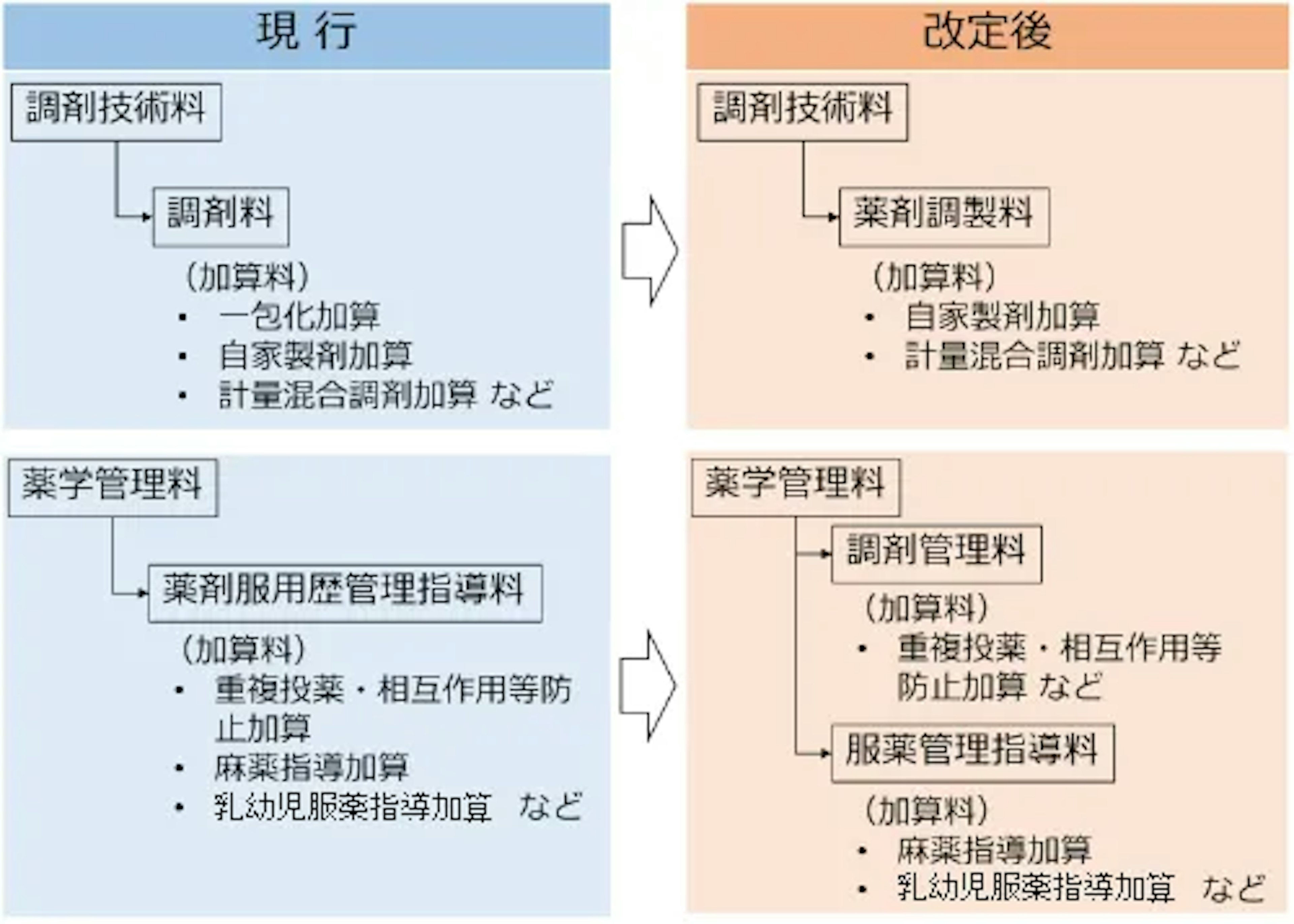 薬局・薬剤師業務の評価体系の見直しとして、現行の調剤料および薬剤服用歴管理指導料について見直しが行われました。令和4年度以降では薬剤調製料、調剤管理料、服薬管理指導料として評価することに変更されました。